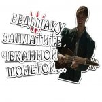 Стикеры по одноименной игре и сериалу. А так же популярная фраза из песни барда Лютика «Ведьмаку заплатите чеканной монетой» из сериала "Ведьмак", которая в последствии стала мемом.
