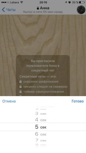 Секретный чат готов, осталось лишь выставить таймер на сообщения, для этого в самом чате в меню наверху нажатием на три точки, откройте окно, в котором мы выберем «Установить таймер самоуничтожения». В открывшемся меню выбираем нужное время. Вот и все ваш секретный чат настроен и готов к безопасному общению.